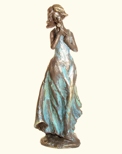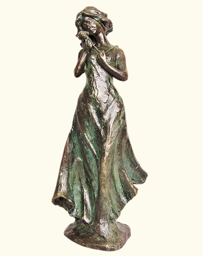Escultura figurativa de mujer sosteniendo una rosa en su mano, figura de bronce sintético en venta SI ESTÁ INTERESADO EN ESTA ESCULTURA, POR FAVOR CONTÁCTENOS (ver PIE DE PÁGINA o SOBRE en la esquina superior derecha de esta página)